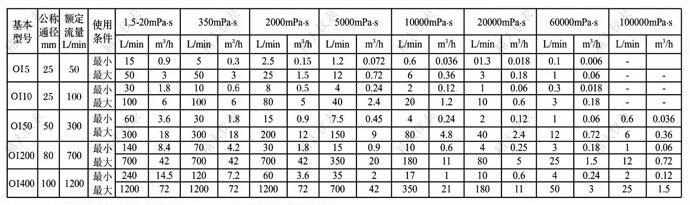 | 基本型號(hào) | 公稱通徑(mm) | 額定流量(L/h) | 使用條件 | 粘度(mPa.s) | |||||||