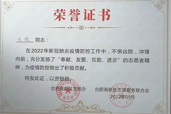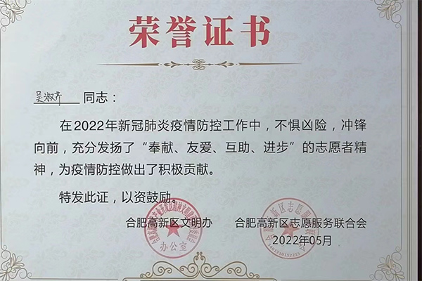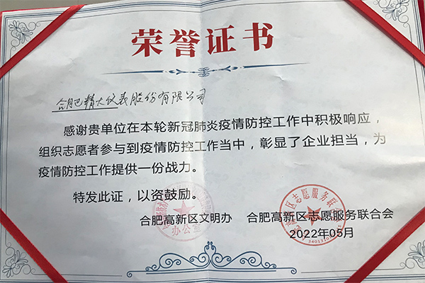 合肥精大儀表股份有限公司在新冠肺炎疫情防控工作中積極響應,組織志愿者參與到疫情防控工作中,彰顯了企業(yè)擔當,為疫情防控工作提供一份戰(zhàn)力。黨員王欣、吳淑芹二位同志在2022年新冠肺炎疫情防控工作中,不懼兇險,沖鋒向前,充分發(fā)揚了“奉獻、友愛、互助、進步”的志愿者精神,為疫情防控做了了積極的貢獻。公司和個人被高新區(qū)文明辦、和高新區(qū)志愿服務聯(lián)合會授予此榮譽證書。