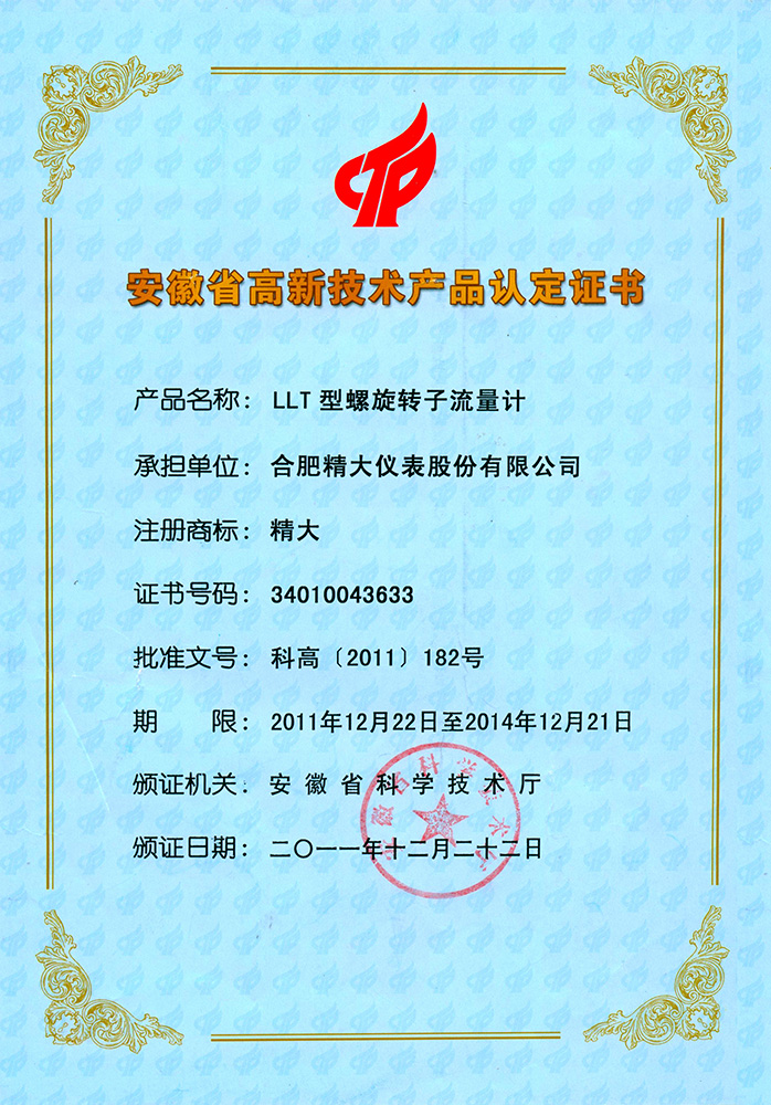 省高新技術(shù)產(chǎn)品認定證書(LLT雙轉(zhuǎn)子)
