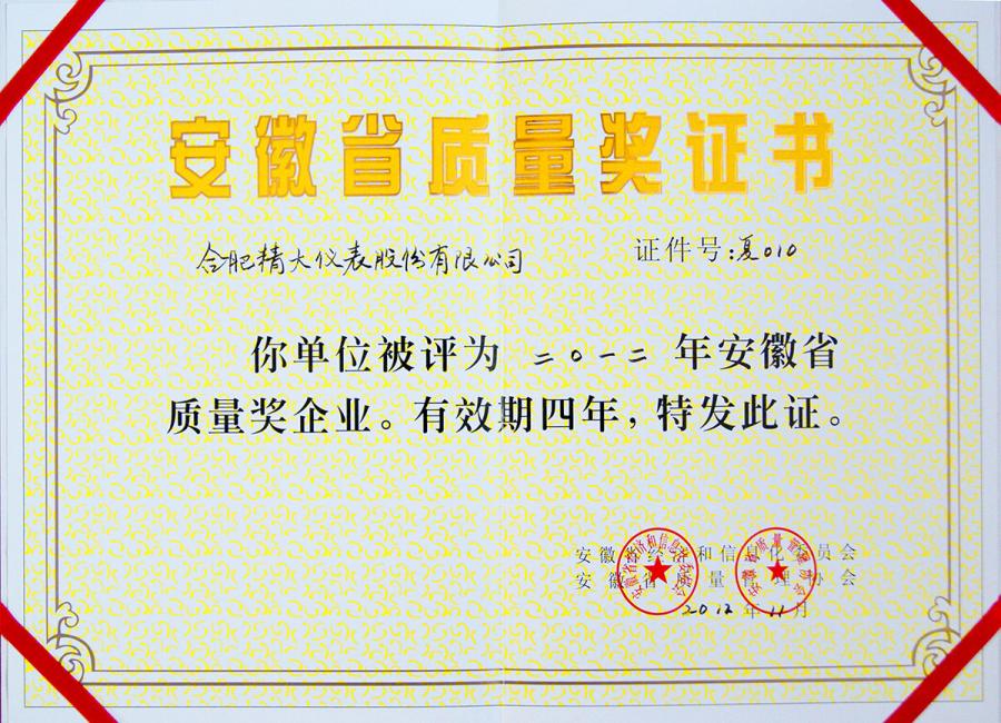 安徽省質(zhì)量獎證書
