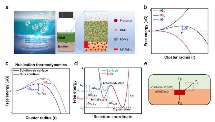 圖1. MAPbBr3鈣鈦礦結(jié)晶與晶體生長(zhǎng)。(a) PDMS輔助結(jié)晶原理圖;(b) 形核半徑與自由能的關(guān)系;(c) 溶液的表面和內(nèi)部的形核半徑的比較;(d)生長(zhǎng)過(guò)程中自由能變化圖解;(e)界面懸浮生長(zhǎng)的力學(xué)圖解。