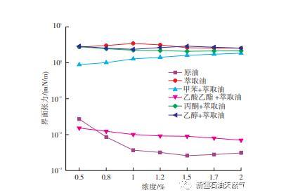 圖4為原油、萃取油以及萃取油分別添加濃度為1%的甲苯洗脫物、乙酸乙酯洗脫物、丙酮洗脫物、乙醇洗脫物配成的模擬油與0.5%,0.8%,1%,1.2%,1.5%,1.7%,2%這七種濃度Na2CO3的界面張力。可以看出,乙酸乙酯洗脫組分與堿的界面張力最低。隨著Na2CO3濃度變大,界面張力也持續(xù)降低,當(dāng)Na2CO3濃度達(dá)到2%時(shí),其界面張力達(dá)到10-3 mN/m。孫景倫等研究了復(fù)合驅(qū)油體系中堿與原油的相互作用,發(fā)現(xiàn)Na2CO3更易于環(huán)烷酸以及苯環(huán)和不飽和酸部分反應(yīng);與飽和酸相比,環(huán)烷酸以及苯環(huán)和不飽和酸的界面活性更強(qiáng),導(dǎo)致界面張力更低。