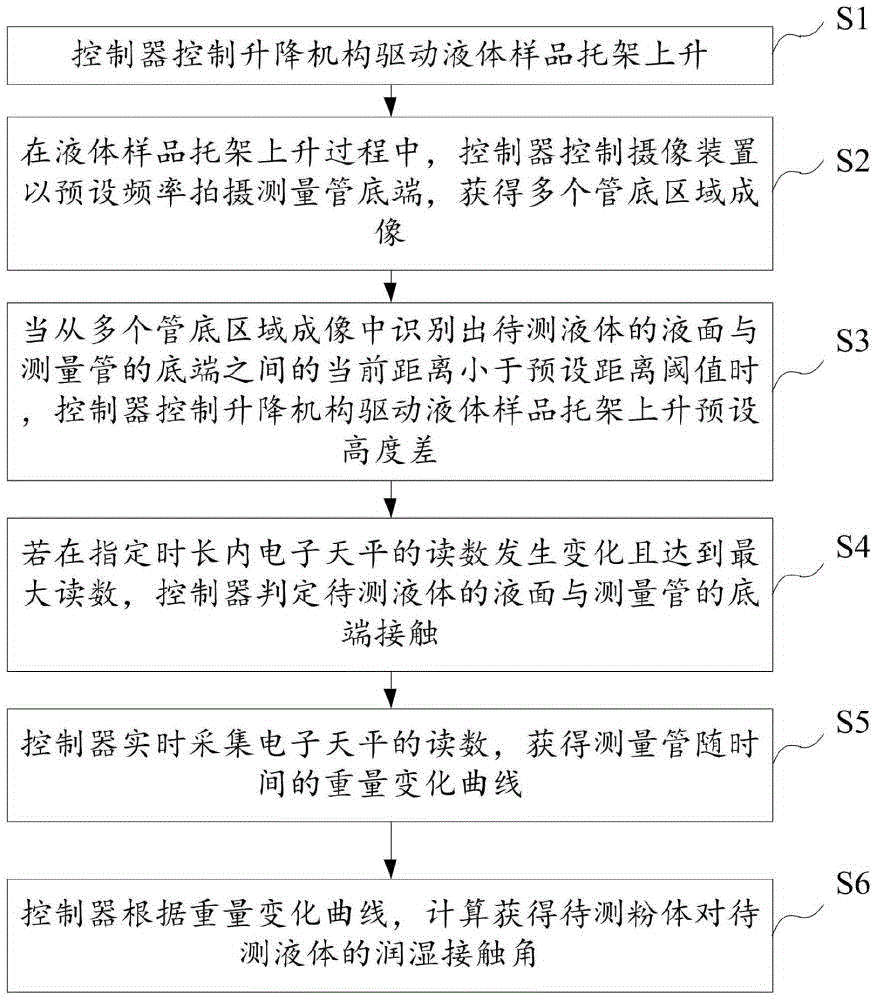 為此,現(xiàn)有技術中提出一些理論,即可選擇潤濕過程中在各個時間段測量粉體床內液體質量,從而得出質量對時間的變化,求取液體對固態(tài)粉體的接觸角。但是,每次稱重測量時,需要將樣品測量管提出液面并擦去連帶的水分,操作比較繁瑣,且無法精確控制每次擦除的液體量,造成了稱重測量過程中的不連貫性,也會使得結果誤差放大。