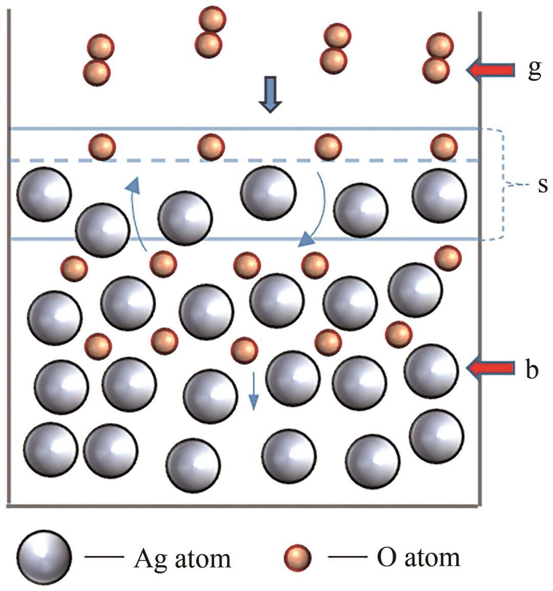根據(jù)圖1,首先O2分子從氣相(g)擴散至表面相(s);其次在Ag的催化下解離為O原子,并發(fā)生化學(xué)吸附;最后,O原子從表面相(s)擴散至本體相(b)。整個過程可以表示為: