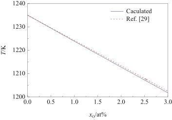 根據(jù)式(23)計算了Ag-O系的液相線,結(jié)果如圖2所示。從圖中可以觀察到,理想溶體近似模型的計算值與實驗相圖[29]非常吻合。因此,可以將Ag-O系視為理想溶體。