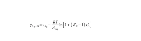 由式(12)和(13)可以看出,Butler方程計算較為復(fù)雜。考慮液態(tài)氧的表面張力很小[14],可以認為γO≈0。另外,由于Ag-O系中O原子數(shù)遠小于Ag原子數(shù)[29],可以將Ag-O溶體視為理想溶體。此時,GE,b=G=G=0。根據(jù)文獻[18],當(dāng)式(12)所示的Butler方程用于描述理想溶液時,通過假設(shè)系統(tǒng)內(nèi)兩組分具有相等的摩爾表面積,可以得到改進的Butler方程。這個改進的Bulter方程能夠推導(dǎo)出Gibbs吸附方程和Langmuir方程,被認為是表面張力和溶液吸附的根本方程。因此,令A(yù)Ag=AO,將式(12)變換為: