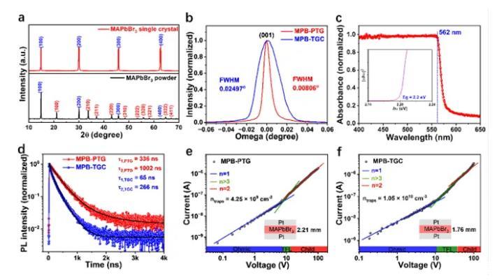 圖3.MAPbBr3鈣鈦礦單晶的表征。(a)粉末XRD和最大面XRD圖譜;(b)XRD搖擺曲線(xiàn);(c)吸收曲線(xiàn)和禁帶寬度;(d)熒光壽命曲線(xiàn);(e)和(f)I-V測(cè)試曲線(xiàn)。