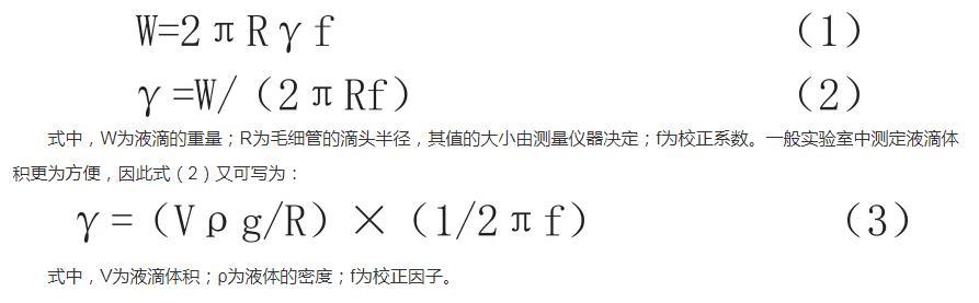 滴體積法的基本原理是這樣的,利用毛細(xì)管滴頭,緩慢往下滴液體,這時(shí)候測(cè)量液滴的大小,就能測(cè)定液體的表面張力。這是因?yàn)橐后w的表面張力,與從毛細(xì)管滴下的液滴的大小有內(nèi)在關(guān)聯(lián),存在正比關(guān)系,這個(gè)關(guān)系可以用數(shù)學(xué)公式表達(dá):