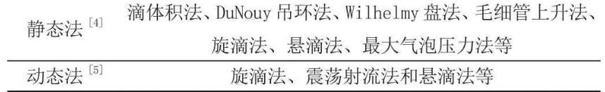 液體表面張力可以通過儀器測(cè)定,目前測(cè)定方法大體上分為動(dòng)態(tài)法和靜態(tài)法。這兩大類方法下面由于細(xì)分,具體分類如表1。