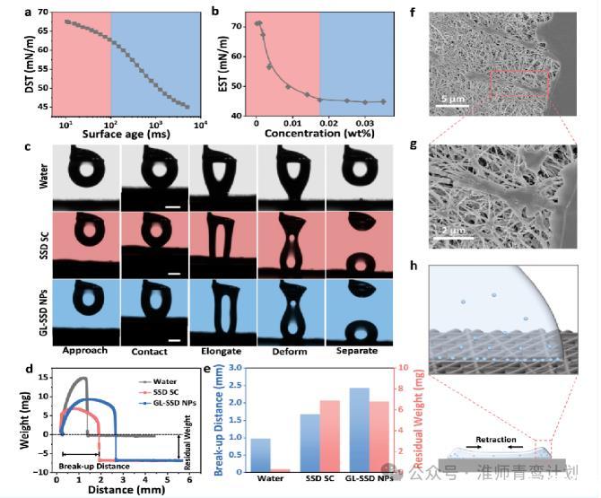 然后,作者研究了GL-SSD NPs液滴在疏水表面的沉積機(jī)理。先是測(cè)量了GL-SSD NPs溶液的動(dòng)態(tài)表面張力(DST)和粘度。DST結(jié)果顯示,GL-SSD NPs溶液在前100 ms內(nèi)發(fā)生輕微變化,這意味著GL-SSD NPs的擴(kuò)散速率較慢,EST值隨著濃度從0到0.018 wt%的增加而減小到45 mN m?1,而當(dāng)濃度高于0.018 wt%時(shí),EST值保持不變。因此,0.018 wt%作為GL-SSD NPs的臨界膠束濃度(CMC)清楚地觀察到接近、接觸、伸長(zhǎng)、變形和分離的順序過(guò)程。從PTFE表面分離后,水滴從表面被徹底清除,沒有留下任何殘留物,而SSD SC和GL-SSD NPs液滴在中間發(fā)生了明顯的伸長(zhǎng)和斷裂,在表面保留了大量的液體。水、SSD SC和GL-SSD NPs的殘余質(zhì)量分別為0.35、6.9和6.8 mg,而GL-SSD NPs溶液的破裂距離為2.43 mm,遠(yuǎn)高于水和SSD SC的0.97 mm和1.68 mm,表明GLSSD NPs與PTFE表面的相互作用最強(qiáng)。此外,掃描電鏡(SEM)圖像顯示,撞擊后的縮回軌跡中留下了大量的液滴殘留物。在液滴撞擊過(guò)程中,大量GL-SSD NPs在三線處的沉積會(huì)利用PTFE表面固有的親水性改變其潤(rùn)濕性,產(chǎn)生固定點(diǎn),延緩液滴縮回。