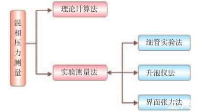 目前測量混相壓力的方法如圖3所示。國內(nèi)外許多專家研究了確定最小混相壓力的方法,包括理論計算和實驗測定。但是,一般的理論計算精確度都不高,而實驗測定方法具有較高的可靠性。實驗測定方法包括細管實驗、升泡儀法及界面張力法等。其中,界面張力法是通過直接測定注氣相與地層原油間的界面張力來確定最小混相壓力,既能觀測到形成混相的狀態(tài),而且操作時間也較短。細管實驗法被認(rèn)為是最可靠的測量最小混相壓力方法,但細管實驗也有局限性,不能模擬黏性指進、重力超覆等因素,實驗周期長,大約需要7~14天,且實驗工作量大。升泡儀法是直接觀察混相過程,測量周期短,1h可以完成測量,測量結(jié)果受人為因素影響嚴(yán)重。而界面張力法是通過直接測定注氣相與地層原油間的界面張力來確定最小混相壓力,既能觀測到形成混相的狀態(tài),而且操作時間也較短,僅需5~6h。