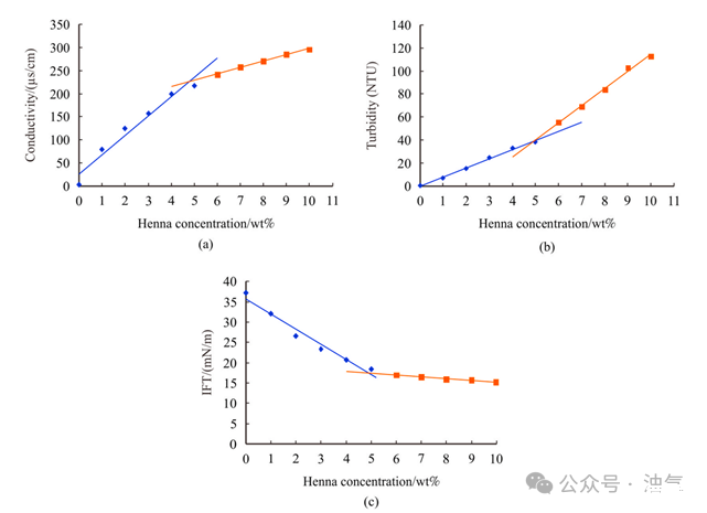 圖1.(a)電導(dǎo)率、(b)濁度和(c)界面張力隨指甲花溶液濃度的變化