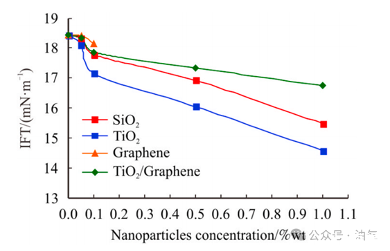 5.單獨的石墨烯納米顆粒對降低油水界面張力的影響可以忽略不計。加之其與TiO2納米顆粒(純TiO2納米顆粒)合成TiO2/石墨烯納米復(fù)合材料時,不利于發(fā)揮作用。因此,石墨烯納米顆粒對EOR來說在操作上和經(jīng)濟上都不可行。