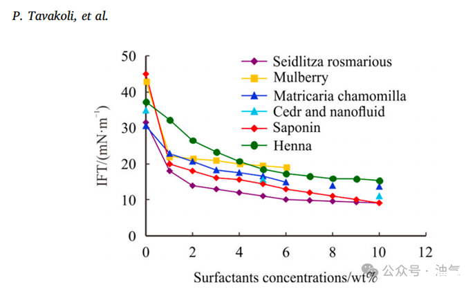 圖3.不同表面活性劑在煤油中作為油相的界面張力:Seidlitzia Rosmarinus、桑葉、洋甘菊、雪松和納米流體、皂角苷(敘利亞棗樹)和指甲花。誤差線表示±5%的標(biāo)準(zhǔn)偏差