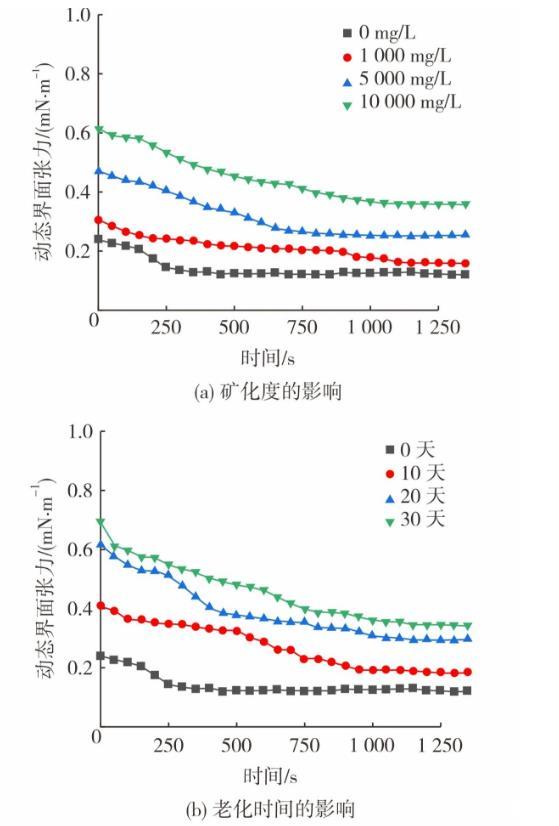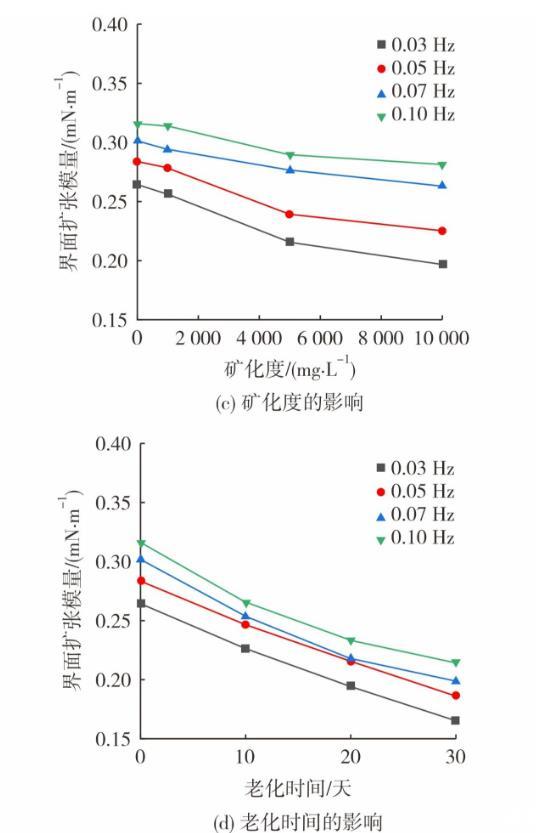圖3為油藏條件對動態(tài)界面張力及界面擴張模量的影響。采用不同礦化度模擬水配制體系(0.06%(w)凍膠分散體+0.10%(w)降黏劑),在50℃老化10天。圖3(a)和圖3(c)呈現(xiàn)了礦化度對體系界面流變性質(zhì)的影響。從圖3可知,隨著礦化度的提高,老化后體系的動態(tài)界面張力穩(wěn)定值從0.127 mN/m增至0.356 mN/m。降黏劑帶有磺酸鹽基團,有較強的耐溫耐鹽能力,因此界面張力的提升幅度有限。此外,體系的界面擴張模量隨礦化度的增大而減低,這是由于地層水陽離子會對凍膠分散體之間的擴散雙電層產(chǎn)生壓縮作用,減小凍膠分散體表面負電量,降低其分散穩(wěn)定性,體系黏度隨之下降。