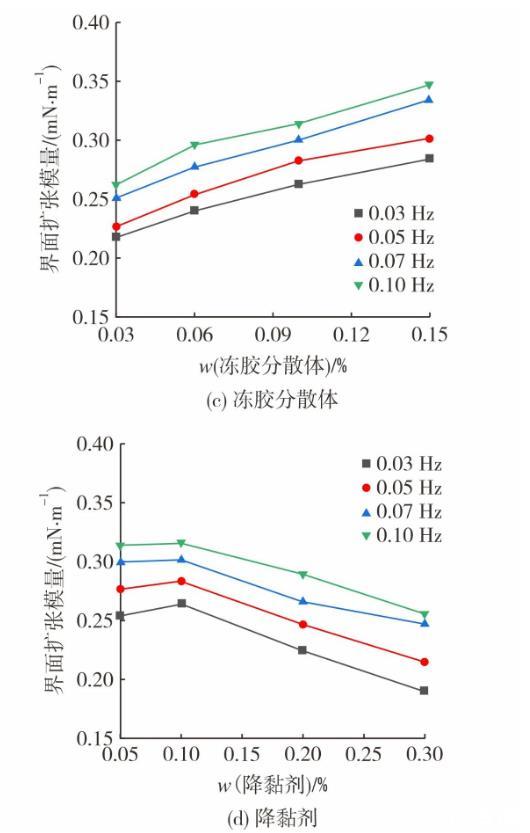 圖2為體系組成對動態(tài)界面張力及界面擴張模量的影響。圖2(a)和圖2(c)呈現(xiàn)了凍膠分散體質(zhì)量分數(shù)對界面流變性質(zhì)的影響。其中,降黏劑質(zhì)量分數(shù)保持為0.10%。隨著振蕩時間的增加,體系界面張力逐漸趨于穩(wěn)定。凍膠分散體在高質(zhì)量分數(shù)時,穩(wěn)定界面張力明顯更高,這是由于在降黏劑質(zhì)量分數(shù)不變時,油水界面上降黏劑分子數(shù)量相對固定凍膠分散體在油水界面的吸附量隨質(zhì)量分數(shù)增大逐漸增加,擠占了降黏劑分子在界面吸附位置。同時,由于體系黏度上升,降低了降黏劑向界面擴散的速度,導(dǎo)致界面張力增加。體系黏度提高,增加了動態(tài)擴張模量,在高質(zhì)量分數(shù)凍膠分散體條件下,黏彈性提升效更加顯著。