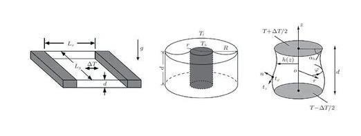 液層模型是源自于空間晶體生長(zhǎng)實(shí)驗(yàn)探索的簡(jiǎn)化模型,是研究微重力條件下界面張力梯度驅(qū)動(dòng)對(duì)流基本流動(dòng)規(guī)律的經(jīng)典模型。液層模型主要包括矩形液層(rectangular pool)、環(huán)形液層(annular pool)和液橋(liquid bridge)(圖1)等。相對(duì)而言,液橋是一類特殊的液層模型。液橋中界面張力梯度驅(qū)動(dòng)對(duì)流的流動(dòng)穩(wěn)定性研究成果極為豐富,相關(guān)系統(tǒng)的完整臨界轉(zhuǎn)捩描述詳見(jiàn)綜述(Hu et al.2008)。除了極薄液層的情況,在絕大多數(shù)界面張力梯度驅(qū)動(dòng)對(duì)流的地面實(shí)驗(yàn)研究中,界面張力效應(yīng)和重力效應(yīng)間存在較強(qiáng)的耦合作用。