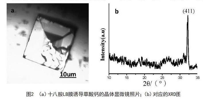 采用XRD表征草酸鈣的成分;收集在十八胺LB膜上的晶體和溶液自發(fā)生成的晶體,用金相顯微鏡表征。