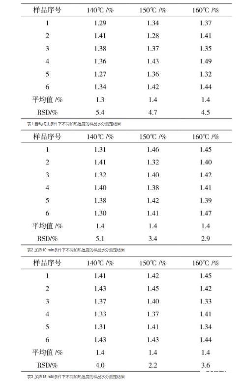 表1自動(dòng)終止條件下不同加熱溫度的樣品水分測(cè)定結(jié)果