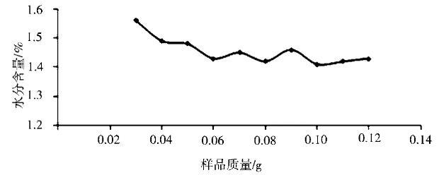 在150℃加熱10 min的測(cè)定條件下,樣品稱(chēng)樣量也會(huì)對(duì)測(cè)定結(jié)果有影響[4]。分別稱(chēng)取0.03g、0.04g、0.05g、0.06g、0.07g、0.08g、0.09 g、0.10g、0.11g、0.12g的樣品質(zhì)量,考察樣品稱(chēng)樣量對(duì)測(cè)定結(jié)果的影響,結(jié)果見(jiàn)圖1。從圖中可以看出,儀器測(cè)得樣品水分含量隨著加入樣品質(zhì)量的增大逐漸趨于穩(wěn)定,當(dāng)單次加入的樣品質(zhì)量較小時(shí),測(cè)得結(jié)果偏高[5]。稱(chēng)量樣品質(zhì)量在50~120 mg結(jié)果無(wú)明顯差異。
