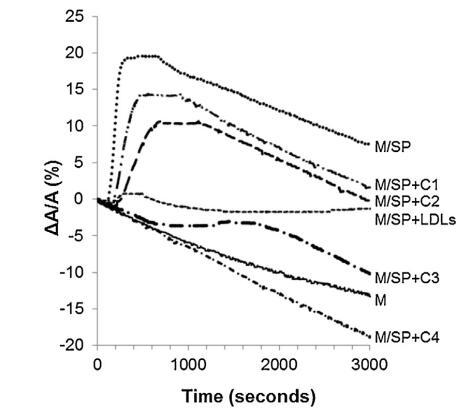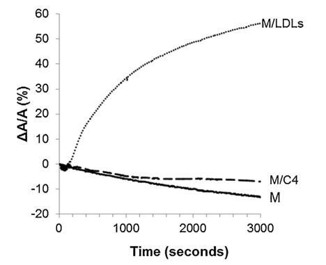 當?shù)兔芏戎鞍着c牛精漿混合時 蛋白質(zhì)重量比為 10:1 (BSP:LDLs) 并注射到單層下方,單層的分子面積隨時間記錄 幾乎沒有變化(曲線 M/SP + LDL,圖 5)。 肩膀出現(xiàn)在 大約 400 s 揭示了 BSP 蛋白的弱吸附(這 肩部代表 M/SP 的 5%,上圖曲線)。 然后,該 1000s后分子面積的變化減少并穩(wěn)定。 不會像 M 和 M/SP 曲線的變化那樣減少, 表明 LDLs 成分的吸附,與 它們在界面處的高擴散能力(曲線 M/LDL,圖 4)。 因此,SP 中所含 BSP 蛋白在界面處的吸附 由于低密度脂蛋白而大大降低,并且 BSP/低密度脂蛋白的比率非常高 接近最佳值以完全防止 BSP 蛋白質(zhì)影響單層。 磷脂酰膽堿注射量 根據(jù)低密度脂蛋白的組成估計為 4.61 毫克 [33]。 因此,注射了 4.61 mg LDLs 的磷脂酰膽堿 26.6mg精漿蛋白質(zhì),即1mg精漿蛋白質(zhì)需要0.17mg磷脂酰膽堿。