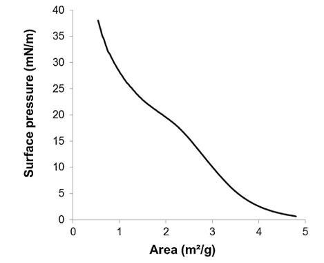 圖 3. 表面壓力-面積 (?-A) 等溫線形成于 通過傳播精漿形成空氣/緩沖液界面(n = 3,標準偏差 在 0-18.9 mN/m 范圍內(nèi)不超過 1.5 mN/m,在 1.2 mN/m 范圍內(nèi)不超過 18.9–38 mN/m)。