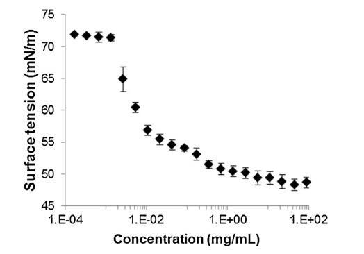 圖 2 牛氣水界面表面張力(±標準差) 精漿溶液中所含蛋白質(zhì)濃度的函數(shù) 提取并以對數(shù)刻度表示 (T = 23.2 ?C ± 0.3 ?C, n = 2, 4 次重復(fù) 每個樣品)。