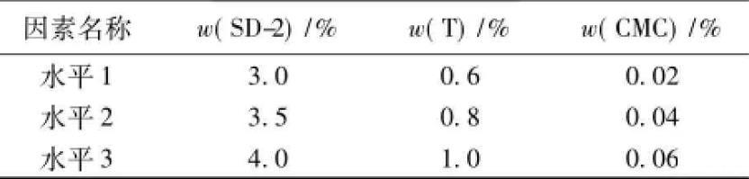 乳化劑SD-2,締合型增稠劑T和羧甲基纖維鈉等是CA砂漿陰離子乳化瀝青中最關(guān)鍵的3種組分,對(duì)乳化瀝青的性能起著決定性的影響。為了比較對(duì)油水界面張力和乳化瀝青貯存穩(wěn)定性的影響,采用L9(34)正交試驗(yàn)的方法進(jìn)行優(yōu)化設(shè)計(jì),因素水平見表1。