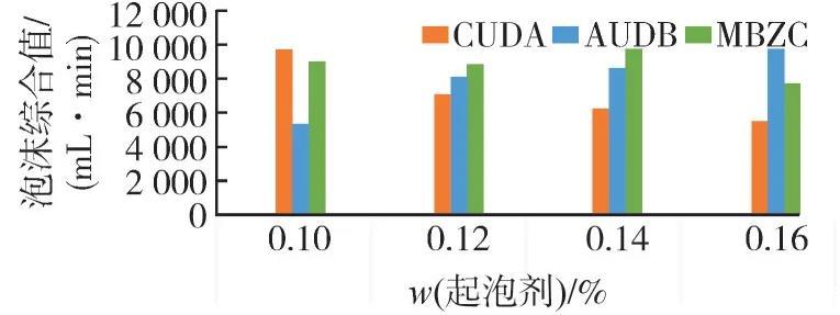 由圖2可知:隨著起泡劑用量的增加,CUDA型起泡劑的泡沫綜合指數(shù)逐漸下降;AUDB型起泡劑的泡沫綜合指數(shù)逐漸升高,且在質(zhì)量分?jǐn)?shù)達(dá)到0.16%時(shí)達(dá)到峰值9 762 mL·min;而MBZC型起泡劑的泡沫綜合指數(shù)先上升后下降。由此可見(jiàn),AUDB型起泡劑的泡沫強(qiáng)度最高。