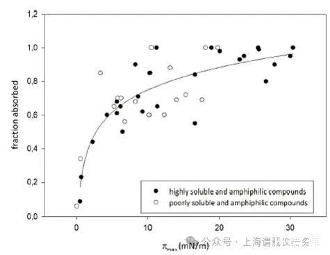 圖5、兩親性化合物的πmax(表面壓力)與PMPAM膜的表觀滲透率相關(guān)性。從圖中可以看出七個(gè)化合物πmax值在介于0和10 mN/m還揭示了低的跨膜滲透性。相比之下,對(duì)于化合物πmax值在20至40 mN/m時(shí)對(duì)PAMPA膜的通透性高。