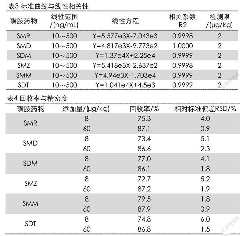 制備混合標(biāo)準(zhǔn)濃度系列,分別為10、50、100、250和500 ng/mL(分別相當(dāng)于被測(cè)組分的含量為2、10、20、50和100μg/kg)。將標(biāo)準(zhǔn)工作液按照2.3.3的方法進(jìn)樣測(cè)試。以進(jìn)樣濃度為橫坐標(biāo),以峰面積的響應(yīng)值為縱坐標(biāo)繪制標(biāo)準(zhǔn)曲線,結(jié)果如表3所。6種磺胺類(lèi)藥物在濃度10~500 ng/mL范圍內(nèi)線性關(guān)系很好,相關(guān)系數(shù)R2≥0.9998。