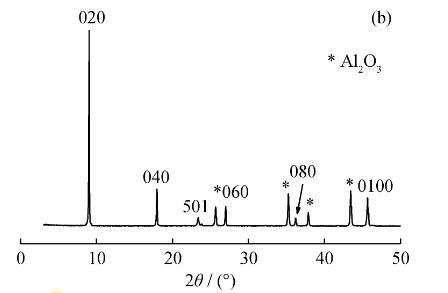 獲得高度b-軸取向的晶種層,是采用二次生長(zhǎng)法制備b-軸取向的ZSM-5分子篩膜的關(guān)鍵。圖1為以LB法在α-Al2O3載體表面組裝的Silicalite-1型分子篩晶種層SEM照片和其XRD譜。由圖1(a)可見(jiàn),合成的Silicalite-1分子篩晶粒呈苯環(huán)狀,粒徑分布均勻,大小約為1μm,且表面幾乎沒(méi)有孿晶生成。使用LB技術(shù)在α-Al2O3載體上組裝的單層Silicalite-1晶種層,連續(xù)致密。由圖1(b)可知,在5°~50°衍射范圍,除去α-Al2O3載體的特征峰,在9.02°(020)、17.94°(040)、26.98(060)、36.22°(080)和45.68°(0100)處均出現(xiàn)了高強(qiáng)度b-軸取向(0k0)晶面特征衍射峰,計(jì)算得到的晶體優(yōu)先取向值KCPO(0k0)=0.93。因此,采用LB法制備的Silicalite-1晶粒層高度致密且呈b-軸取向。