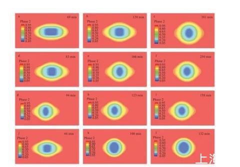 由計算流體力學后處理軟件所得到的液滴形態(tài)變化圖,可以看到液滴由最初的圓柱形變化成橢球形,再由橢球形變化成球形。與實驗所得到的各時刻形態(tài)圖液滴變化趨勢相同,時間上略有誤差,可能是由于基質(zhì)導熱速率、加熱臺功率,以及室溫的影響。