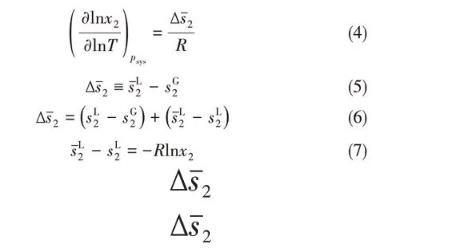 溫度對(duì)界面張力的影響比較復(fù)雜,首先溫度影響界面張力隨壓力的下降速度,隨著溫度的升高,界面張力下降速度越來越緩,使得不同等溫線在某個(gè)壓力范圍內(nèi)有交叉點(diǎn);其次,不同區(qū)域內(nèi),溫度對(duì)界面張力的影響不同。在交叉點(diǎn)以上,界面張力隨溫度的升高而減小,而交叉點(diǎn)之下,界面張力隨溫度的升高而增大。為了分析溫度對(duì)CO2溶解度的影響,將Gibbs-Helmholtz方程計(jì)算的溶解度對(duì)溫度的導(dǎo)數(shù)與偏摩爾熵聯(lián)系起來,如式(4)~式(7)所示