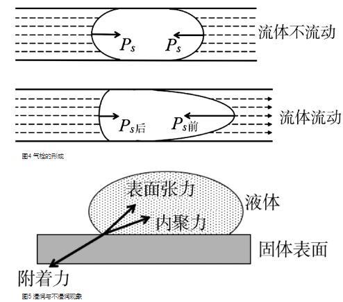 如圖4所示,當流管中流體不流動時,流體中的氣泡呈橢球狀,兩邊對稱.但當流體流動時會造成氣泡的變形,沿流體前進方向,氣泡前端被“拉伸”而變尖,曲率半徑變?。欢蠓奖弧巴茐骸倍兺?,曲率半徑變大.由(2)式可知,前端的附件壓強PS前要比后端的附加壓強PS后大,從而造成流體流動受阻.當氣泡較多時阻力隨著增大,就造成了氣栓。