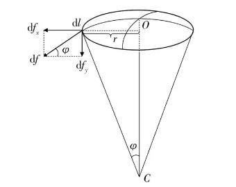 下面來推導(dǎo)附加壓強的大小.對于球形液面,設(shè)求半徑R,取球面邊線上一個微元dl,圓心角φ,邊線圓半徑r,如圖3所示.