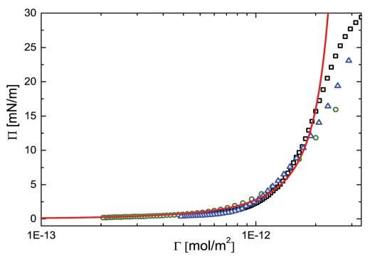 圖 2 表面壓力(P)與吸附的 PNIPAM 顆粒量 (G) 在空氣-水界面上。 開放符號(hào)表示實(shí)驗(yàn) 對(duì)應(yīng)于三組不同實(shí)驗(yàn)的數(shù)據(jù)點(diǎn) 即:(,)具有高初始粒子負(fù)載的 NIMA 槽,(B)NIMA 低初始粒子負(fù)載的槽和 (D) Kibron m 槽 高初始粒子負(fù)載。 紅色實(shí)線表示預(yù)測(cè) 使用 Groot 和 Stoyanov 模型制作。