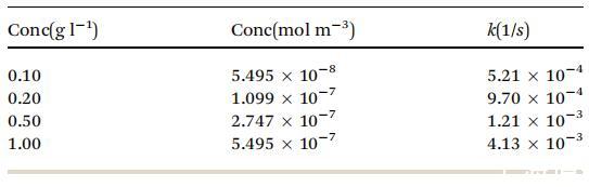 表 2 不同濃度的速率常數(shù) k(1/s) 值 由圖 6 中的實(shí)驗(yàn)曲線計(jì)算