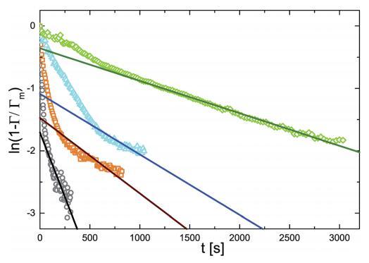圖 6 ln(1 - r/rm) 作為不同體積濃度的時(shí)間函數(shù) 微凝膠顆粒:(>)0.10 g l-1 , (D)0.20 克 l-1 , (,)0.50 克 l- 1 , (乙) 1.00 克 l- 1 . 實(shí)線是直線擬合。