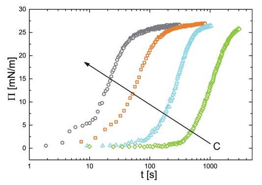 已經(jīng)建立了一個(gè)狀態(tài)方程來關(guān)聯(lián) 表面壓力和吸附量,我們現(xiàn)在繼續(xù) 研究顆粒的吸附動(dòng)力學(xué)。 為此我們 監(jiān)測(cè)新鮮的界面張力的演變 在 PNIPAM 顆粒懸浮液中制備氣泡作為 時(shí)間的函數(shù)。 我們轉(zhuǎn)換界面張力值 轉(zhuǎn)化為表面壓力。 結(jié)果如圖 4 所示。 表面壓力值最初迅速增加,然后 放松到最終的平衡值。 動(dòng)態(tài)可以一目了然 分為兩個(gè)獨(dú)立的時(shí)間尺度:初始快速 由表面壓力增加表示的動(dòng)力學(xué) 值,以及隨著系統(tǒng)向最終放松而緩慢的部分 平衡狀態(tài)。 快速動(dòng)力學(xué)之間的這種區(qū)別 短時(shí)間和長(zhǎng)時(shí)間慢得多的動(dòng)力學(xué)是許多表面活性物質(zhì)的吸附行為的特征 材料.32,33