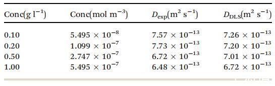 表 1 擴(kuò)散系數(shù) D (m2 s- 1 ) 對(duì)于各種 從實(shí)驗(yàn) G vs. t1/2 曲線計(jì)算的濃度 與使用 DLS 測(cè)量的相比
