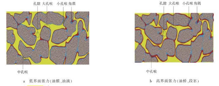 凝析氣藏開發(fā)過程中伴隨著油氣界面張力σog的變化,當?shù)貙訅毫Ω哂诼饵c壓力時,處于混相狀態(tài),油氣界面張力接近0 mN/m;當?shù)貙訅毫β缘陀诼饵c壓力時,出現(xiàn)反凝析現(xiàn)象,少量凝析油析出,此時油氣界面張力較小,析出的凝析油以油膜狀態(tài)附著在束縛水之上,即以油膜鋪展方式分布于儲層中。在曲率較大的孔隙角隅處,由于毛細凝聚作用,以油滴方式分布,凝析油易流動,實驗測量的凝析油臨界流動飽和度一般小于10%[14](見圖1a);隨著凝析氣藏的開發(fā),當?shù)貙訅毫h低于露點壓力時,大量凝析油析出,油氣界面張力迅速增加,到最大反凝析壓力時的界面張力可比露點壓力時的高2個數(shù)量級[4]。析出的凝析油大部分以段塞的形式分布于孔隙喉道與角隅,相對于凝析油膜更難以流動,凝析油臨界流動飽和度增大(見圖1b)。