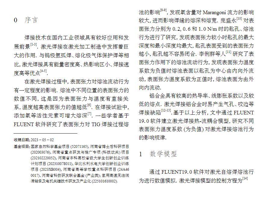 基于FLUENT19.0軟件,建立了激光焊接熱-流耦合模型,對(duì)比分析了不同表面張力溫度系數(shù)(為負(fù)值)對(duì)熔池流場(chǎng)的影響。