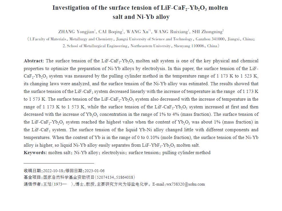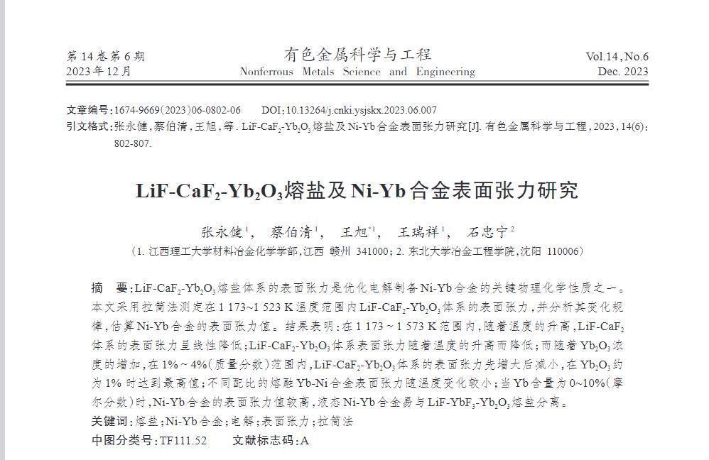 LiF-CaF2-Yb2O3熔鹽體系的表面張力是優(yōu)化電解制備Ni-Yb合金的關(guān)鍵物理化學(xué)性質(zhì)之一。本文采用拉筒法測(cè)定在1173~1523 K溫度范圍內(nèi)LiF-CaF2-Yb2O3體系的表面張力,并分析其變化規(guī)律,估算Ni-Yb合金的表面張力值。