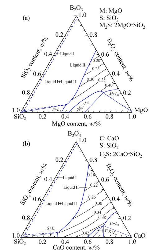 1873K時含B2O3三元體系等溫相圖及液相線如圖4所示。實際條件下,Si常存在于金屬相中,而SiO2則以硼硅酸鹽的形式存在于熔渣中,因此,SiO2添加對含B2O3三元體系熱力學性質(zhì)的影響仍有待確定,MgO-B2O3-SiO2、CaO-B2O3-SiO2和Al2O3-B2O3-SiO2三元系相圖也需要進一步優(yōu)化。1873K時含B2O3三元體系熔渣等表面張力線如圖4所示。結(jié)果表明,在MgO-B2O3-SiO2體系和CaO-B2O3-SiO2體系1873K完全液相區(qū)(Liquid II)范圍內(nèi),熔渣表面張力值在0.15~0.45 N/m范圍內(nèi);隨著B2O3含量的增加,表面張力顯著降低;隨著SiO2含量、MgO含量和CaO含量的增加,熔渣表面張力逐漸增大,但MgO含量和CaO含量對表面張力的影響更加顯著。在Al2O3-B2O3-SiO2體系1873K完全液相區(qū)(Liquid)范圍內(nèi),熔渣表面張力在0.10~0.30 N/m范圍內(nèi);熔渣表面張力隨B2O3含量的增加而逐漸減小,隨SiO2含量和Al2O3含量的增加而逐漸增大。