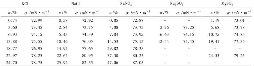 表2 293 K下,無(wú)機(jī)鹽的質(zhì)量分?jǐn)?shù)與水溶液界面張力的關(guān)系