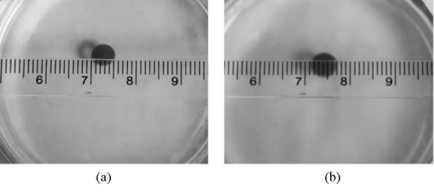 圖3油酸在純水(a)與飽和Na2SO4溶液(b)上形態(tài)