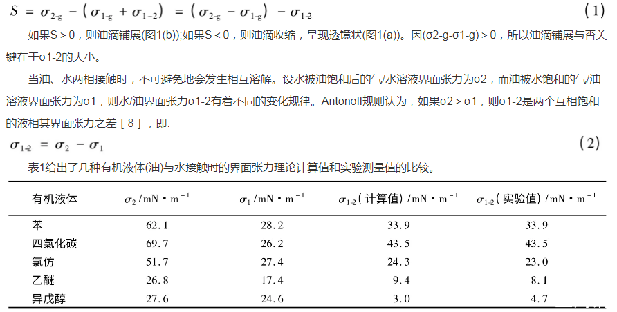 圖1中液體表面存在界面張力[5-6],其值的大小是物質(zhì)分子間相互作用的一種反映,與物質(zhì)的本性有關(guān)。在常見(jiàn)純液體中,水的界面張力最高,25℃時(shí)為72.0mN·m-1,極性有機(jī)物液體的界面張力大多低于50mN·m-1,非極性有機(jī)液體的界面張力一般更?。?]。由此可知,氣/水界面張力大于氣/油界面張力,即σ2-g>σ1-g。根據(jù)鋪展系數(shù)(S)的定義: