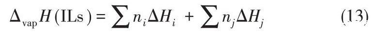 2008年,Verevkin[71]開發(fā)了一種基于經(jīng)驗(yàn)公式的簡單相加法來計(jì)算ILs的蒸發(fā)焓,該焓被分解為構(gòu)成元素的主要成分和輔助成分的校正(基于結(jié)構(gòu)上的特殊性,例如CF3基團(tuán)或環(huán)狀結(jié)構(gòu)的存在)