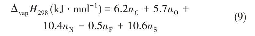 2005年,Kabo等[37]用Knudsen滲流法測出了[C4mim][Tf2N]的蒸氣壓,從而計(jì)算得到汽化焓,Kabo等基于有效原子的相加性提出式(9)計(jì)算298 K的汽化焓